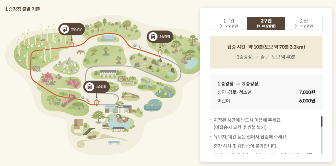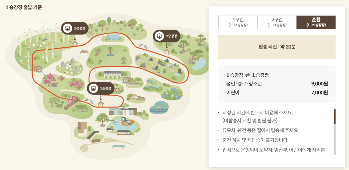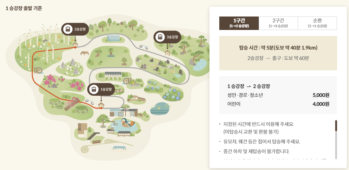 - 모노레일 탑승권 : 1승강장은 온라인 예매, 2,3승강장은 현장구매 가능(※ 반드시 지정된 시간에 이용해야함)