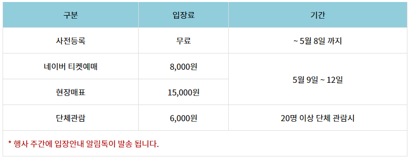 | 장 소 | 사전등록기간 | 입장료 |