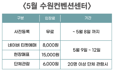 | 수원컨벤션센터 | ~ '24년 5월 8일까지 | 무료 |